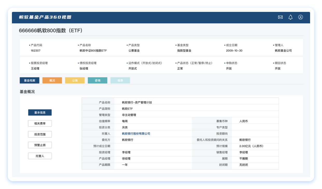 围绕产品关键指标,构建产品360视图,快速获取产品当前及历史基本信息如持仓结构、风险偏好、绩效归因等情况。