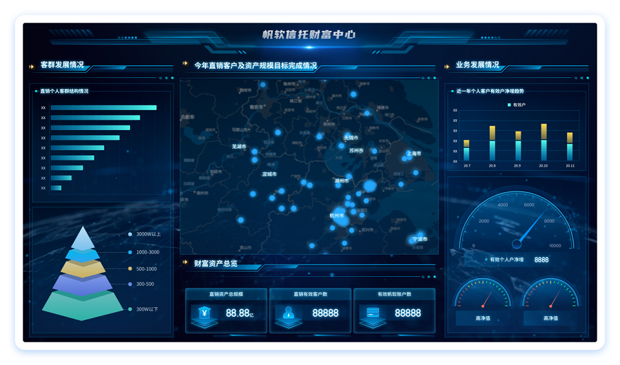 提炼信托业经营管理核心关键指标,面向企业管理层全方位展示企业经营健康状况,辅助科学决策。