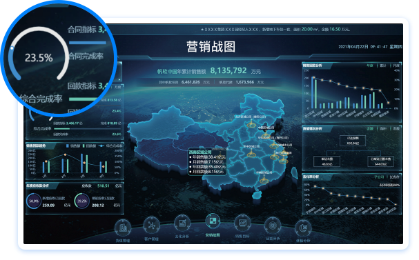 依托体系化营销管理驾驶舱,搭建营销战图,解决企业数据难触达、问题难分析的应用痛点。