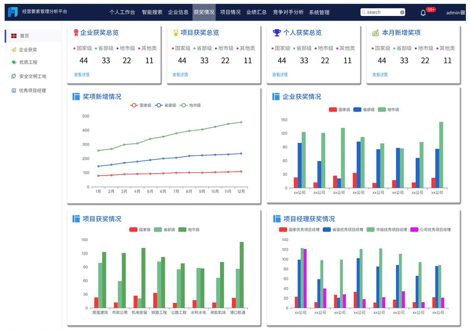 提取资质、业绩中的关键数据如中标下浮率等,进行不同维度的展示分析,给投标人员在项目报价的时候提供数据参考。