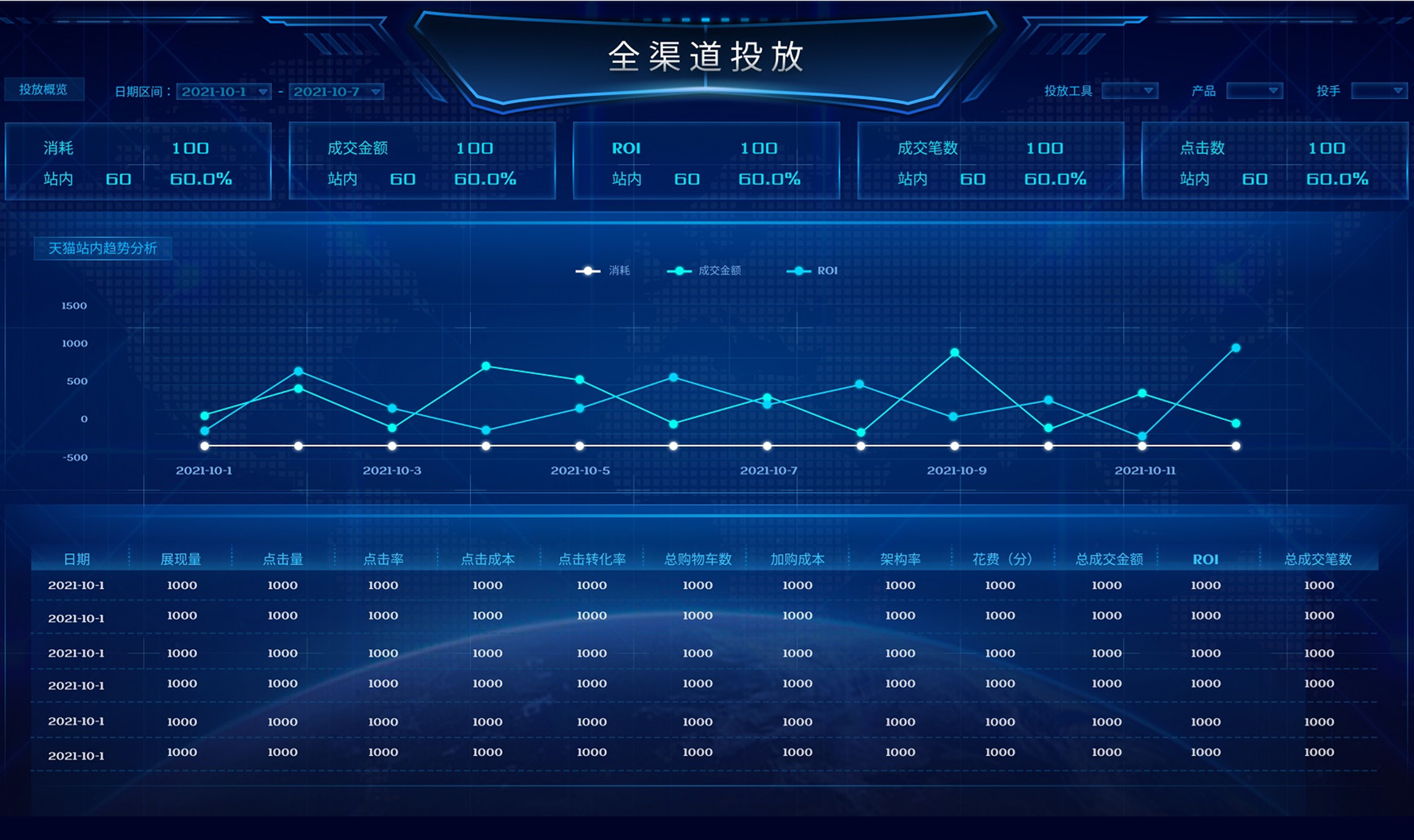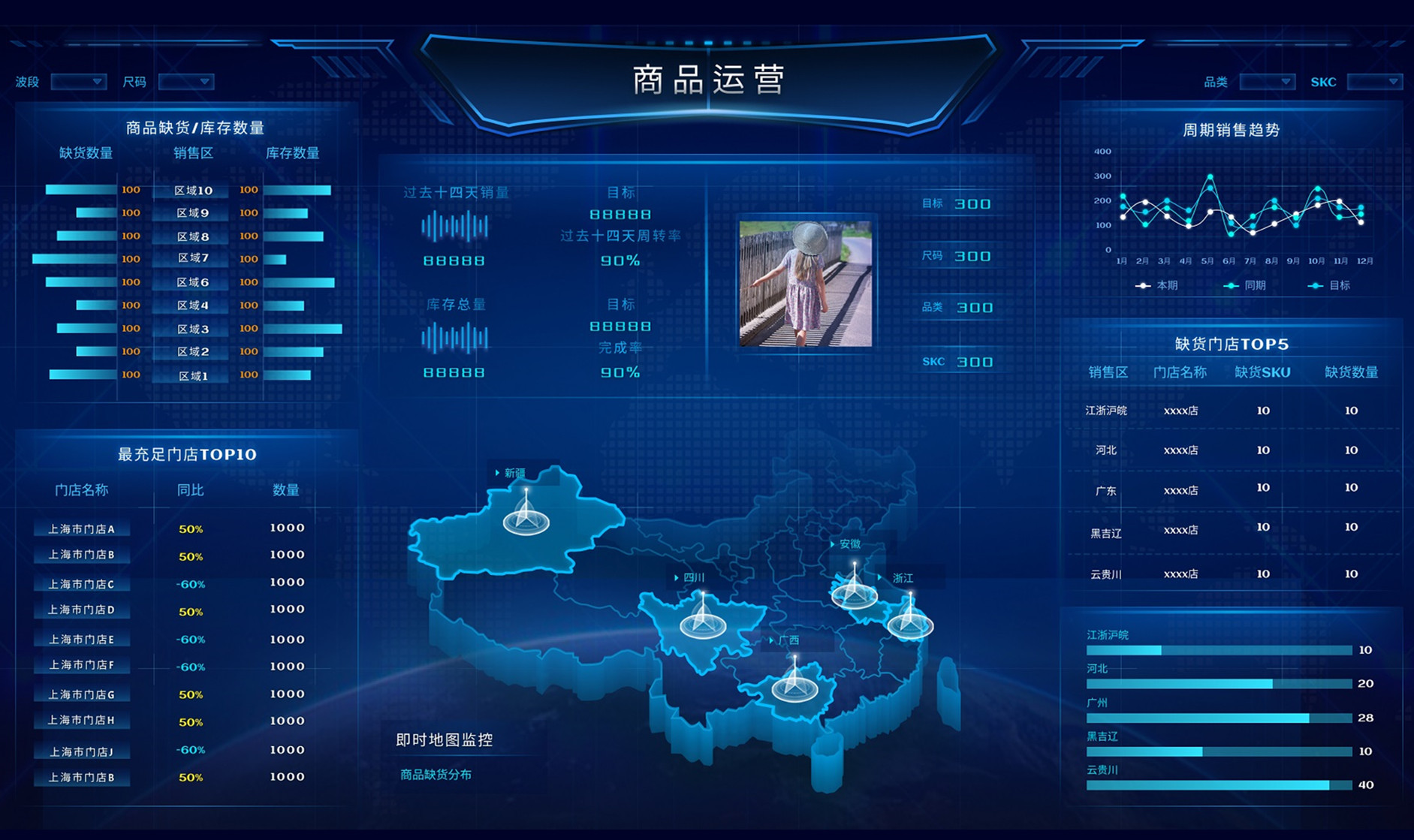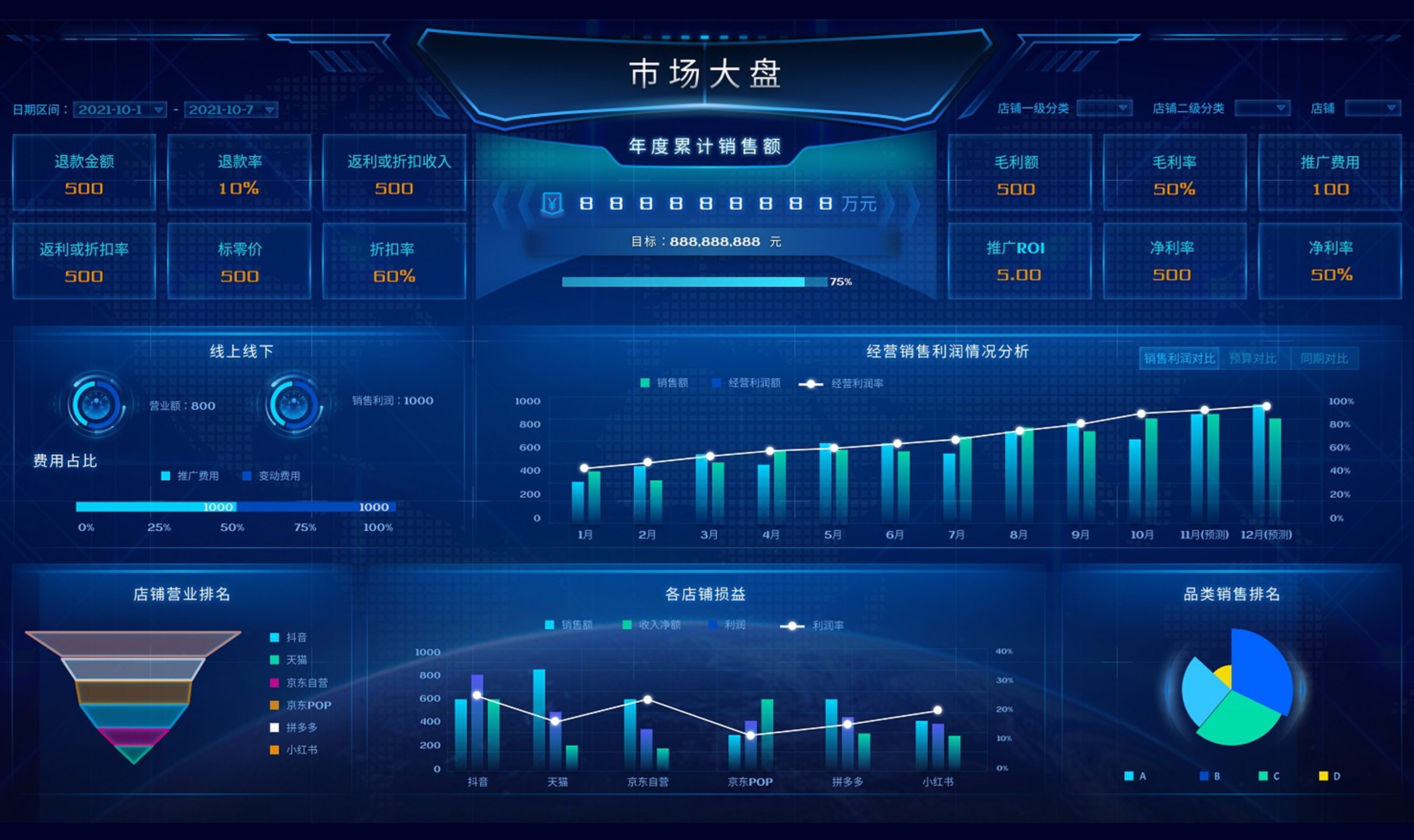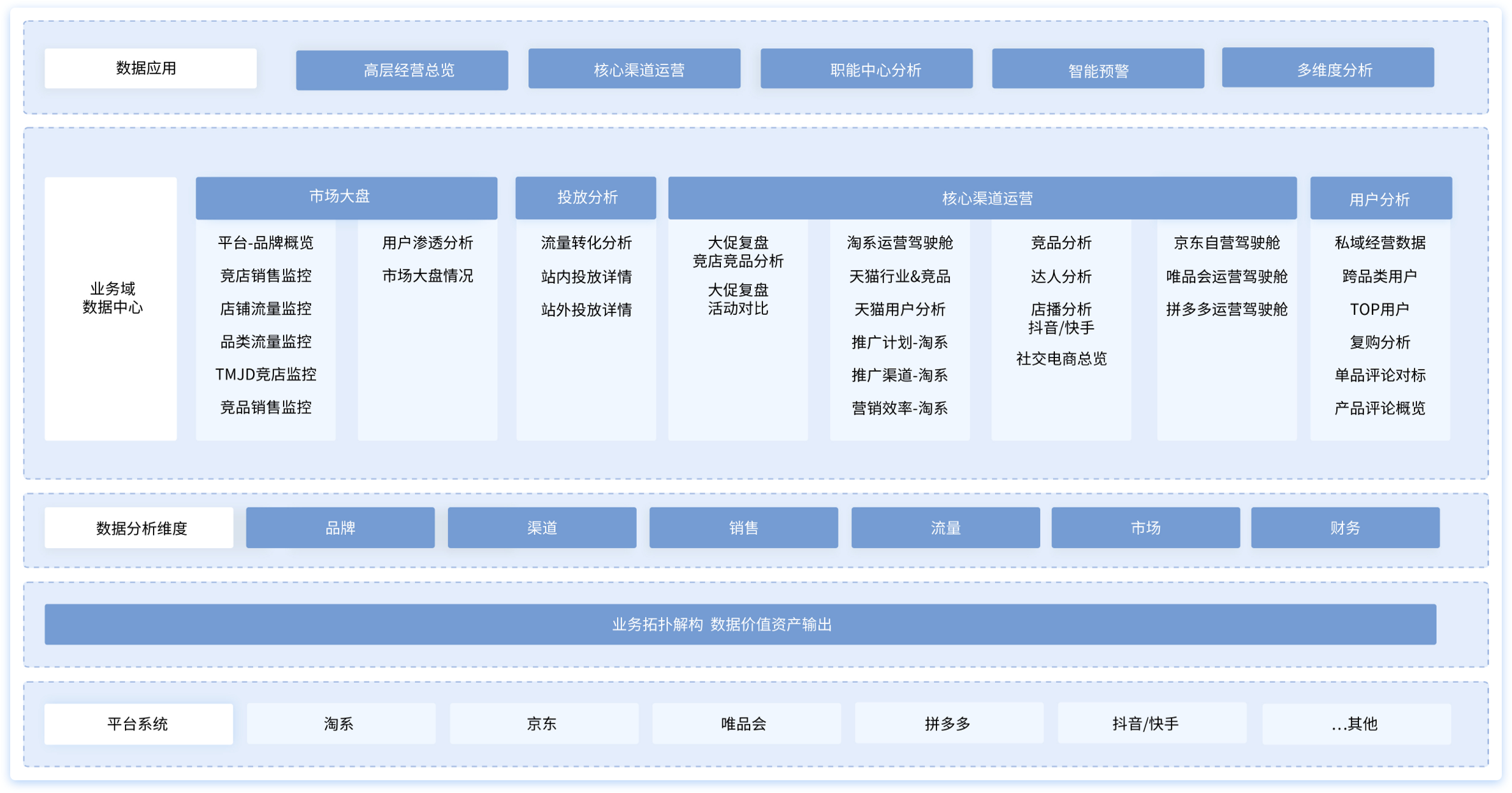 3. 搭建电商BI分析体系,提供电商场景包,通过可视化的方式,进行各个场景的数据洞察、监控、复盘,对电商市场进行全平台精细化运营。