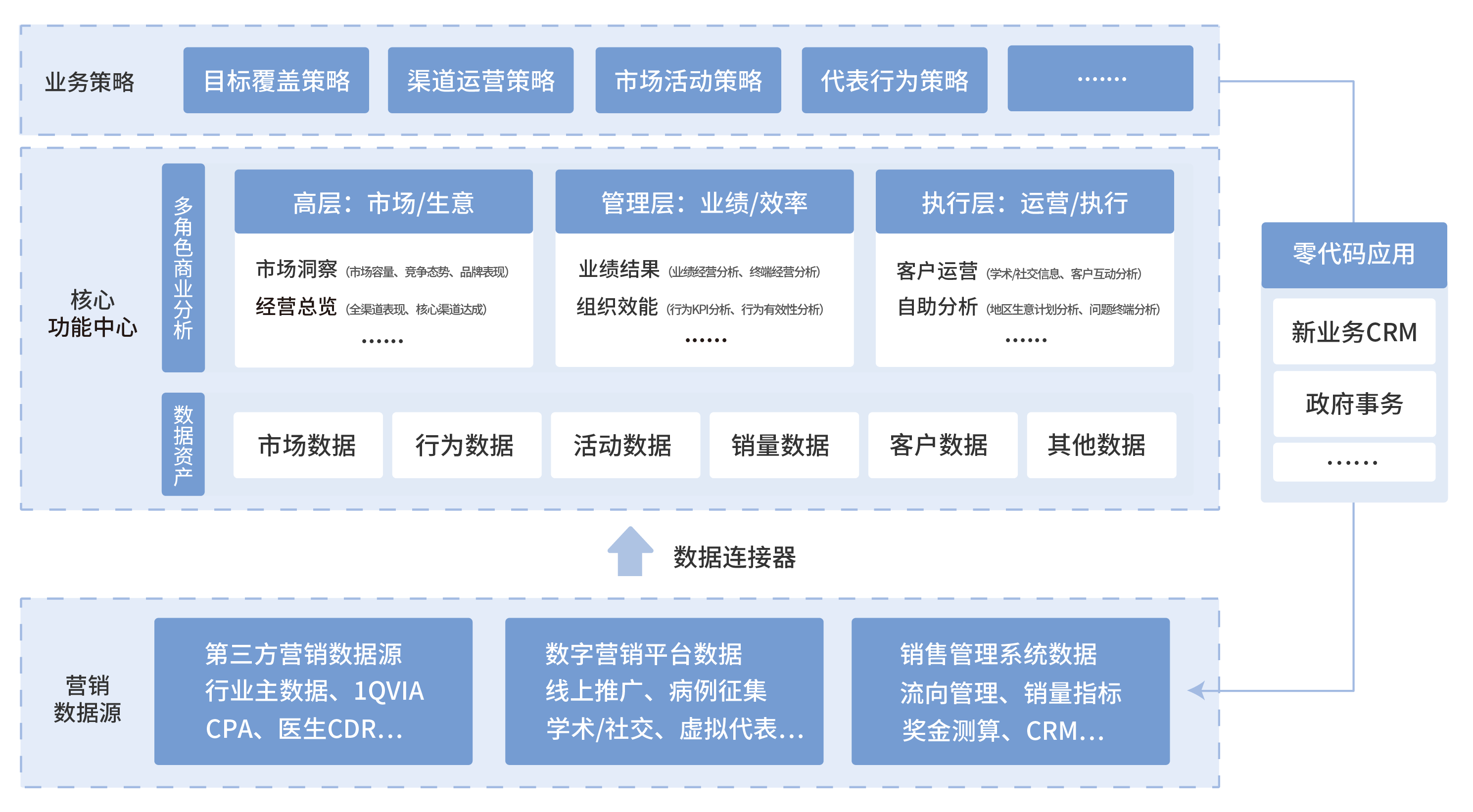 制药企业需要面向涵盖公立医疗、零售药店和公立基层医疗三大终端下的城市公立医院、县级公立医院、实体药店、网上药店等六类市场。数据采集的途径多种多样,综合利用困难重重。