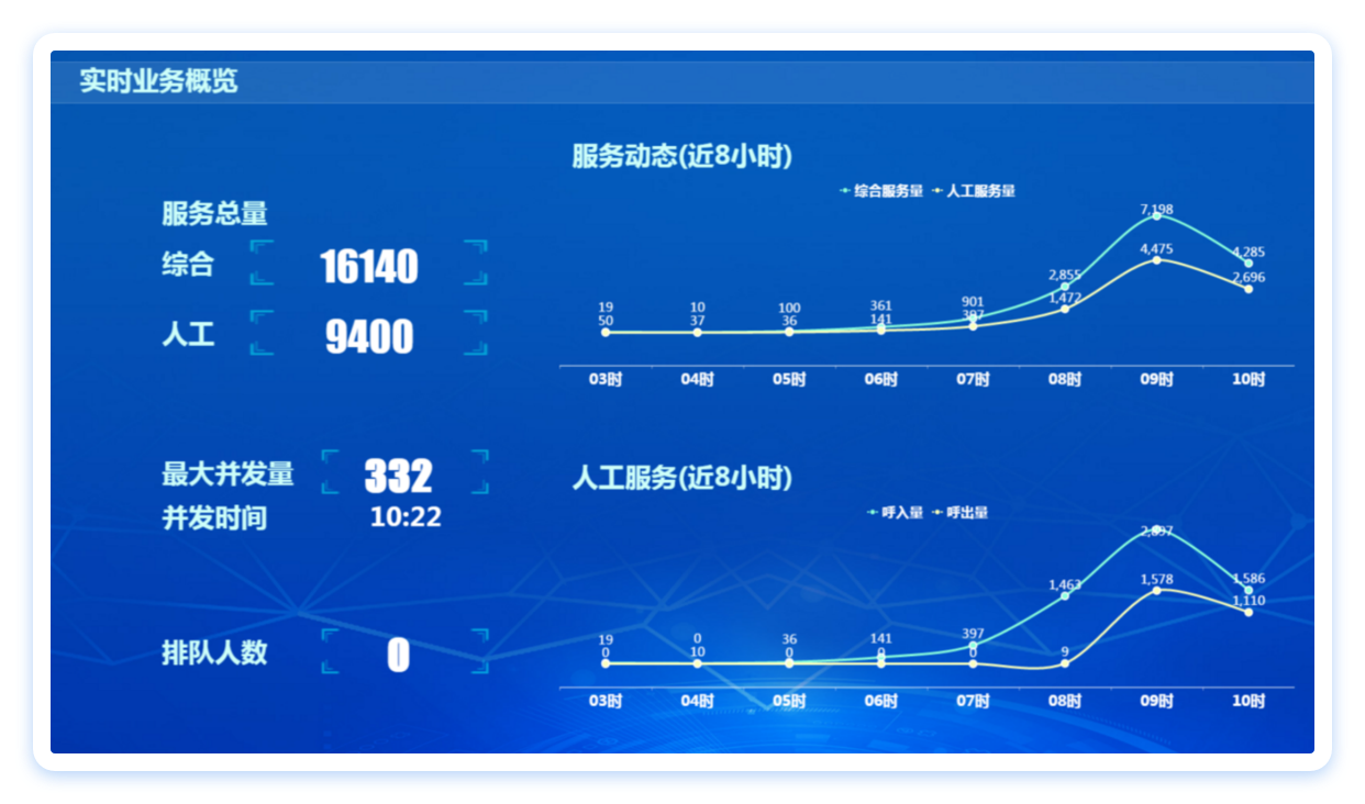 展示年度业务概览和实时业务概览,包括服务总量(分为综合和人工),最大并发量和并发时间,排队人数以及近8个小时的服务动态。